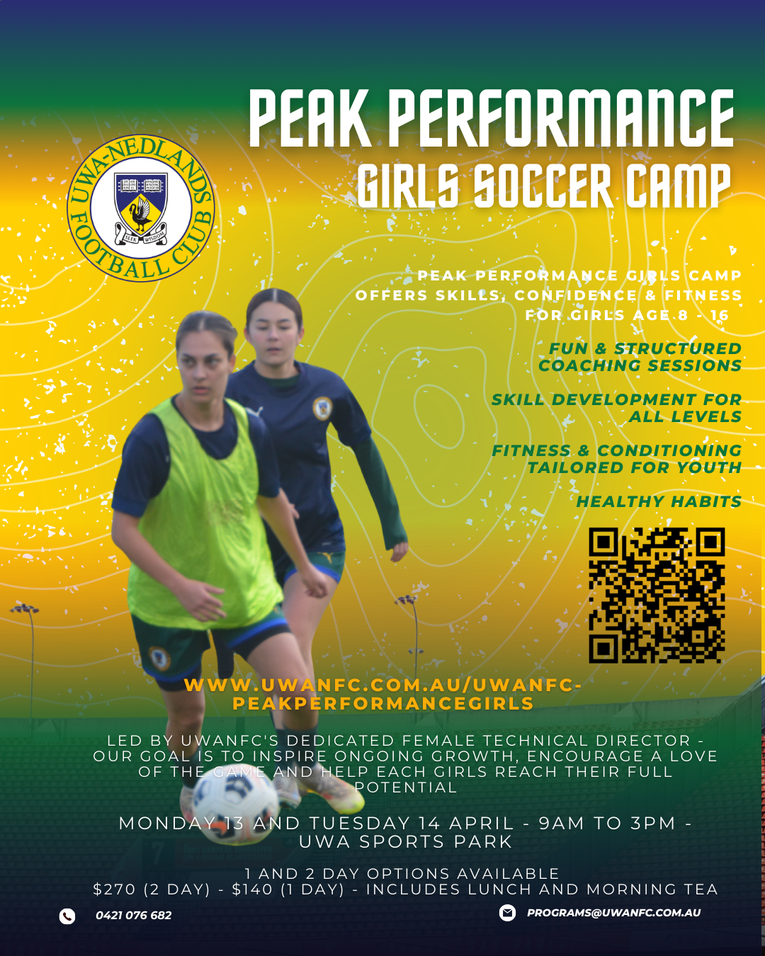 Peak Performance Girls Soccer Camp is delivered by UWA Nedlands FC, one of Perth’s leading junior female clubs. With teams competing in JDL1 across multiple age groups and guided by a dedicated Female Technical Director, the club is committed to the long-term development of girls in football. Through its structured Female Football Plan, UWA Nedlands FC provides an aligned and inclusive pathway designed to support the growth, confidence, and sustained enjoyment of every player.